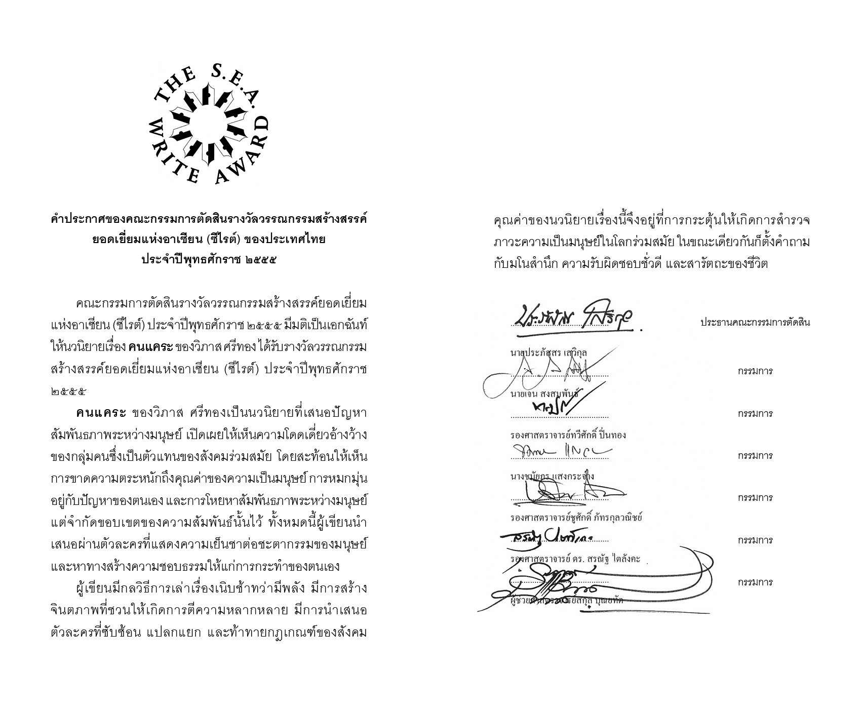 คำประกาศของคณะกรรมการตัดสินรางวัลวรรณกรรมสร้างสรรค์ยอดเยี่ยมแห่งอาเซียน (ซีไรต์) ของประเทศไทยประจำปีพุทธศักราช 2555