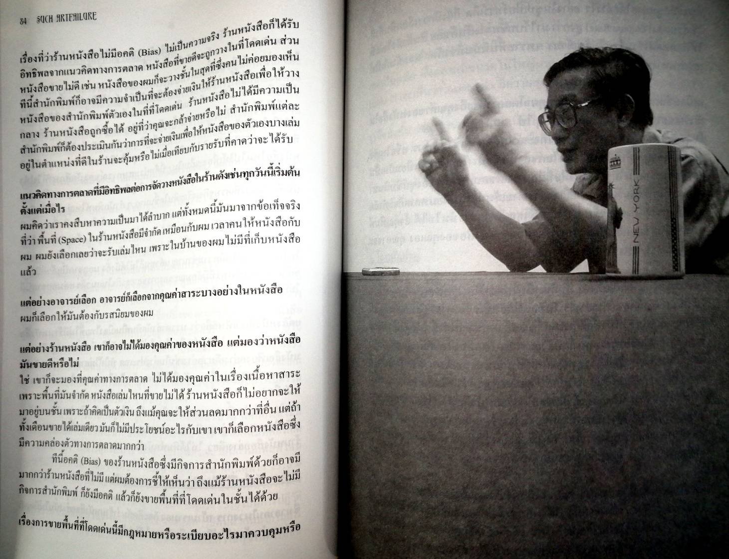 คือคุณก็ต้องต่อสู้ในทางธุรกิจ เรื่องที่จะเอาเหตุผลในเชิงวิชาการ หรือในเชิงจริยธรรมมาพูด มันเป็นไปไม่ได้ในโลกของทุนนิยม โลกของทุนนิยมมันเป็นอย่างนี้ ถ้าตลาดมันไม่ชอบหนังสือที่มีสาระ แต่ชอบหนังสือเรื่องซุบซิบนินทาหรือหนังสือที่เขียนโดยดารา แล้วคุณเดินตามเส้นทางทุนนิยม ตลาดก็จะกำกับนโยบายการจัดการของร้านหนังสือ ซึ่งคุณก็ทำอะไรมันไม่ได้ ถ้าคุณพิมพ์หนังสือที่มีสาระ แล้วเปิดร้านหนังสือเพื่อขายหนังสือของคุณเอง คุณอาจจะขาดทุนจากธุรกิจทั้งสองอย่าง (หัวเราะ)