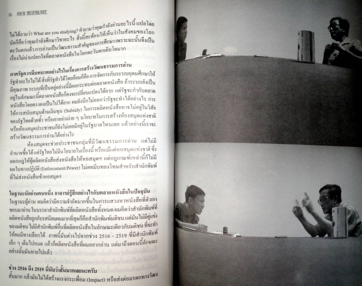 รัฐทำอะไรไม่ได้ สิ่งที่รัฐทำได้โดยอ้อมก็คือ การจัดการกับระบบอุดมศึกษาให้มีคุณภาพ ระบบที่เป็นอยู่อย่างนี้มีผลกระทบต่อตลาดหนังสือถ้าระบบยังเป็นอยู่ในลักษณะนี้ตลาดหนังสือก็คงเปลี่ยนแปลงได้ยาก แต่รัฐจะกำกับตลาดหนังสือโดยตรงคงเป็นไปได้ยาก ผมยังนึกไม่ออกว่ารัฐจะทำได้อย่างไร การให้การสนับสนุนด้านเงินทุน (Subsidy) ในการผลิตหนังสืออาจไม่อยู่ในวิสัยของรัฐไทยด้วยซ้ำ หรือเอาง่ายๆ นโยบายในการสร้างห้องสมุดแห่งชาติหรือห้องสมุดประชาชนก็ยังไม่เคยมีอยู่ในรัฐบาลไหนเลย แล้วอย่างนี้เราจะสร้างวัฒนธรรมการอ่านได้อย่างไร