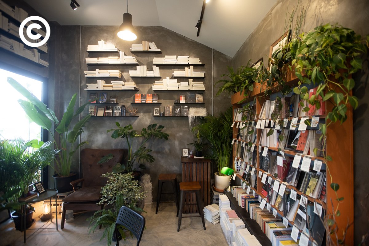 “เราอยากให้ลูกค้ามานั่งคุยกันเฮฮา ไม่ต้องรีบร้อน ไม่ต้องรู้สึกว่าฉันต้องลุกแล้วนะ เดี๋ยวจะมีคนใหม่เข้ามา การจัดพื้นที่ในร้านจึงเกิดจากความต้องการสองอย่างผสมกัน คือ อยากให้คอนเนกท์กันด้วย แต่ก็ต้องการให้แยกขาดจากกันด้วย” สิทธิวัฒน์เสริมถึงการจัดวางที่นั่งภายในร้าน ที่มีทั้งโซนในคาเฟ่หนังสือ โซนภายนอกใต้ชายคา และพื้นที่ด้านนอกสุดที่มองเห็นทัศนียภาพโดยรอบ โดยแต่ละโต๊ะแยกออกจากกันโดยอาศัยต้นไม้ใบเขียวเป็นเครื่องกั้นกลาง