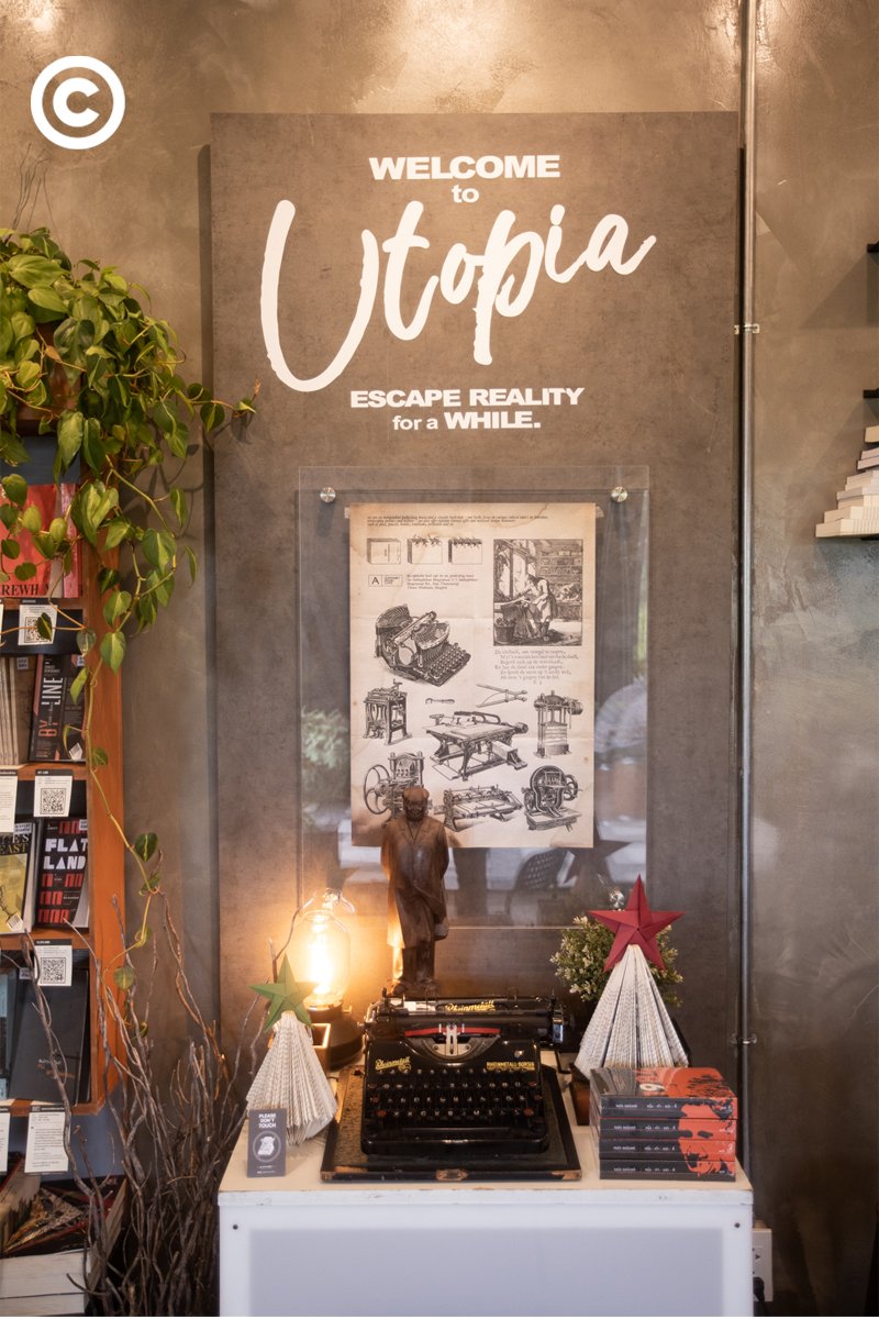 “และด้วยกิมมิคอย่างหนังสือหรือ quote คำพูดต่างๆ ที่สอดแทรกอยู่ตามแต่ละโต๊ะ ซึ่งอาจจะยังไม่โดนวันนี้ แต่น่าจะโดนใครสักคนเข้าในสักวัน” เขาเล่าเพิ่มเติมถึงการประดับตกแต่งร้านโดยใช้บรรดาสิ่งพิมพ์ที่เป็นผลงานของสำนักพิมพ์สมมติมาจัดวางอย่างลงตัว