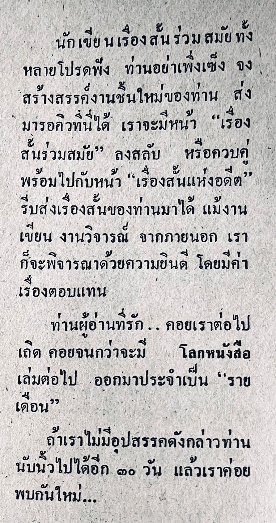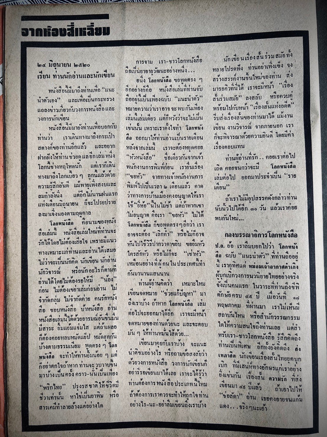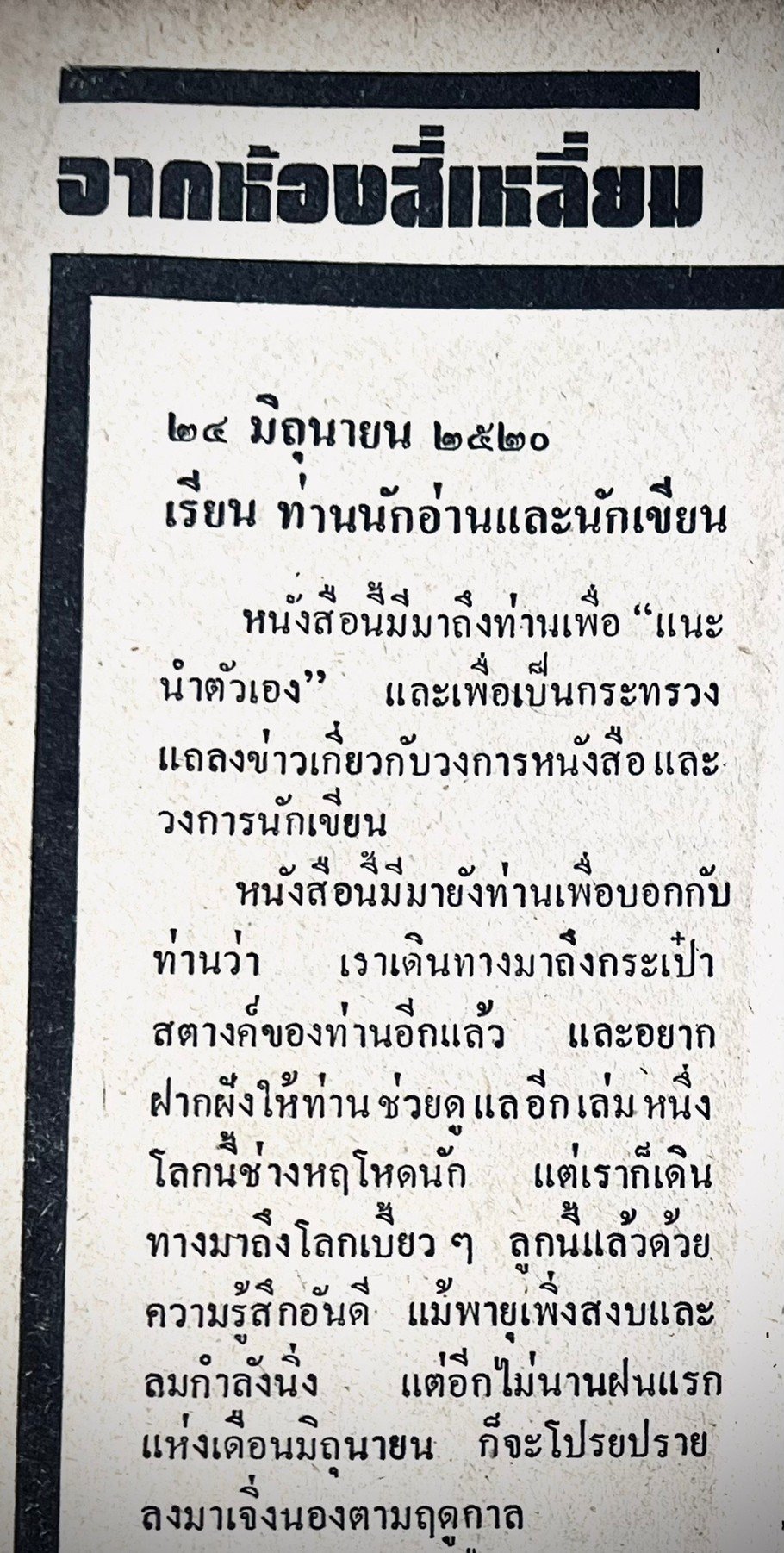 จาก โลกหนังสือฉบับแนะนำตัว ‘จากห้องสี่เหลี่ยม’ กันยายน 2520 บรรณาธิการโดย สุชาติ สวัสดิ์ศรี