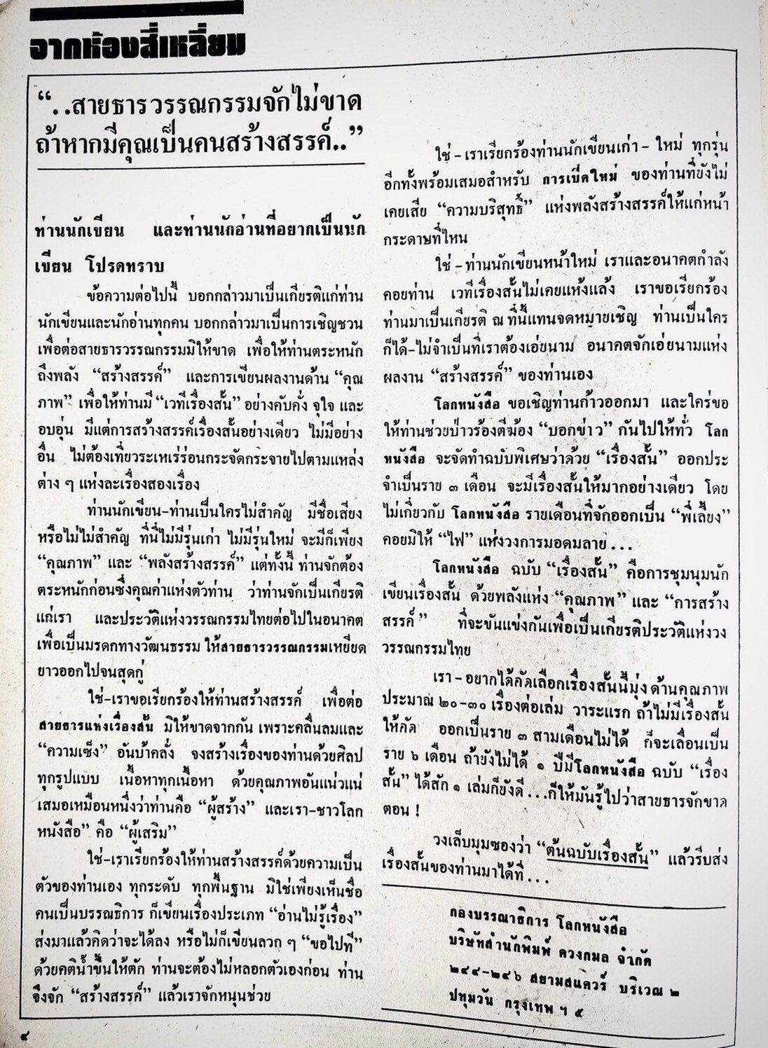โลกหนังสือ ขอเชิญท่านก้าวออกมา และใคร่ขอให้ท่านช่วยป่าวร้องตีฆ้อง ‘บอกข่าว’ กันไปให้ทั่ว โลกหนังสือ จะจัดทำฉบับพิเศษว่าด้วย ’เรื่องสั้น’ ออกประจำราย 3 เดือน จะมีเรื่องสั้นให้มากอย่างเดียว โดยไม่เกี่ยว โลกหนังสือ รายเดือนที่จะออกเป็น ‘พี่เลี้ยง’ คอยมิให้ ‘ไฟ’ แห่งวงการมอดมลาย...