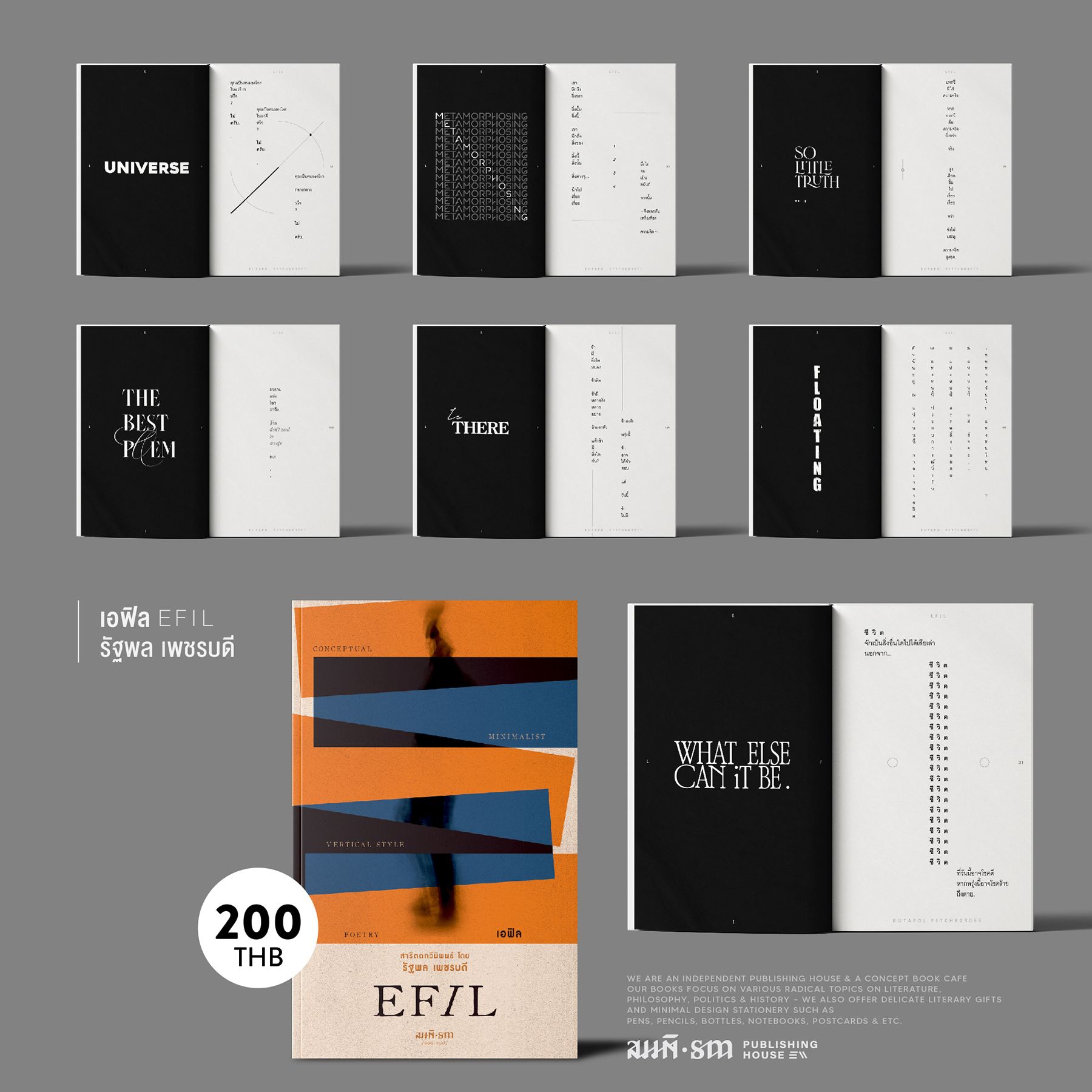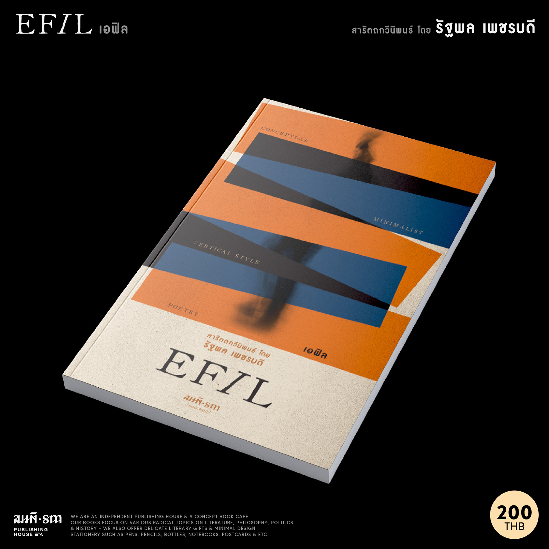 สุดท้ายที่จะเล่าสู่กันฟังก็คือ งานกวีนิพนธ์ประเภทสารัตถศิลป์มักมาคู่กับความคิดเชิงนามธรรม (คู่กันประหนึ่งผีเน่ากับโลงผุอย่างไรอย่างนั้น) ซึ่งตัวคุณรัฐพลเอง ก็เป็นที่ทราบกันดีว่าได้เดินอยู่บนหนทางแห่งความคิดสกุลนี้มาเป็นระยะทางประมาณหนึ่ง (และก็ยังคงย่ำเดินอยู่ต่อ) ดังนั้นความกังวลในเบื้องต้น (ถ้ามี) ที่ว่าบทกวีหรือข้อความต่างๆ ที่จัดเรียงอยู่ใน EFIL อาจจะมาจากความคิดที่ไม่คงรูป ย้อนแย้งสะเปะสะปะ จับแพะชนแกะ หรืออะไรก็ตามที่แสดงถึงความขาดไร้ซึ่งภาวะแห่งความเป็นเอกภาพและความสมดุล ข้าพเจ้าจะขอแนะว่าให้สลัดความกังวลนั้นทิ้งไปได้เลย และท้ายที่สุด (จริงๆ) ถ้าจะให้ข้าพเจ้าชี้แนะเพิ่มเติมถึงสิ่งที่ควรรู้เกี่ยวกับ EFIL อีกสักเรื่องสองเรื่อง ข้าพเจ้าคงขออนุญาตกล่าวว่า “พอ!” และไปเริ่มต้นอ่านกันได้แล้ว (ฮา)