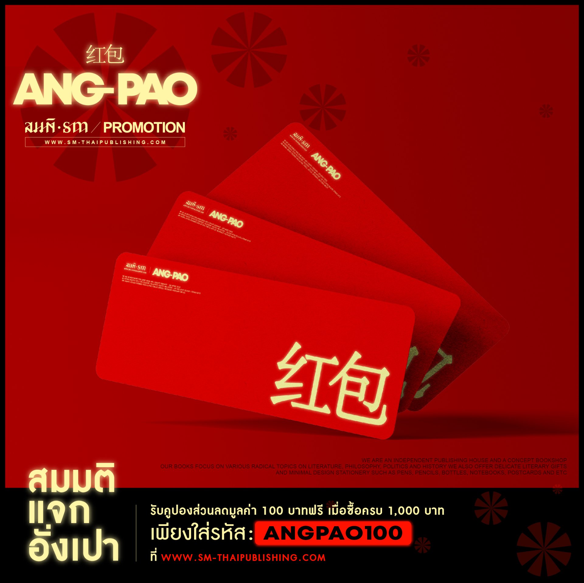 สมมติแจกอั่งเปา ใช้ได้ทั้ง Website // ใส่โค้ด ANGPAO100 ที่หน้าสรุปรายการสั่งซื้อ กรอกช่อง 'ใส่รหัสคูปอง' (เมื่อสั่งซื้อครบ 1,000 บาท)